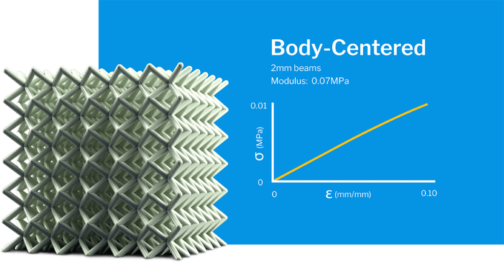 Applications: With its high strain elastic response, the Body-Centered lattice is a good candidate for foam replacement in products under static compression. The angled struts pointing towards the center of the cell make its response even and consistent.