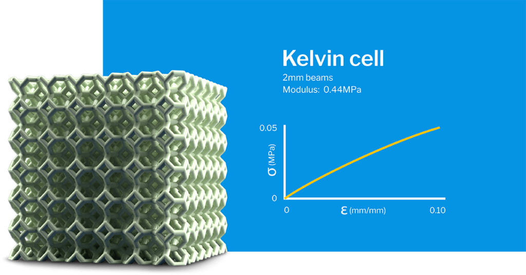 Buckling response: Unlike the Simple Cubic lattice, the Kelvin cell lattice structure has a low buckling point, meaning that its beams stretch in response to force. The Kelvin cell lattice does not have a plateau and compresses continuously with a simple elastic stiffness until it is fully compacted.