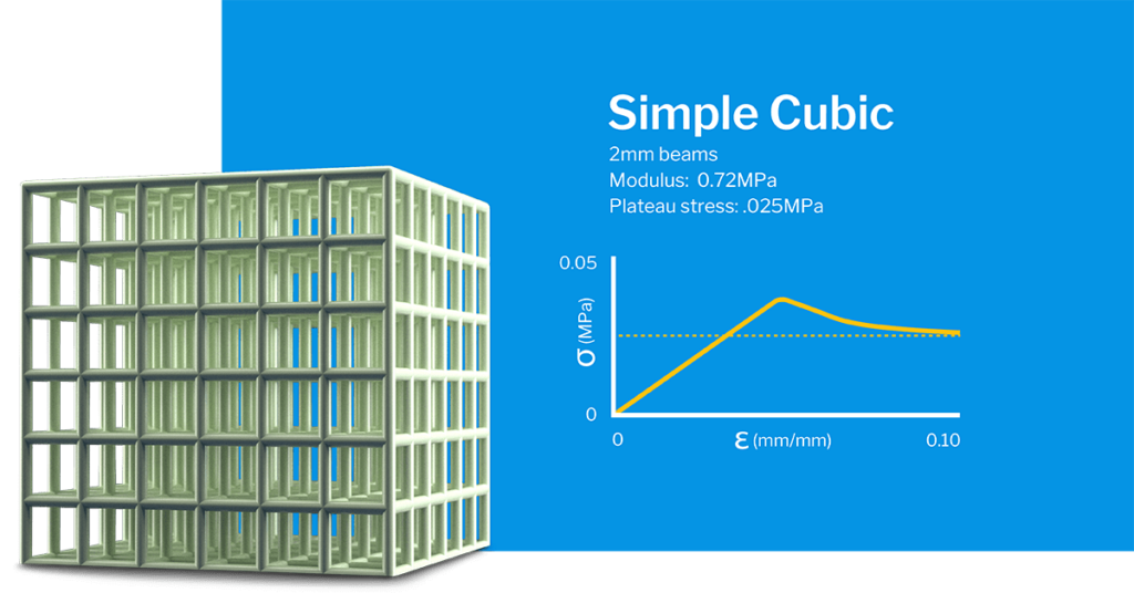 Applications: The buckling response of this Simple Cubic lattice produces a force threshold that makes it a good candidate for personal protection applications and for shielding sensitive components. This lattice type is also effective for filling gaps between components in assemblies.