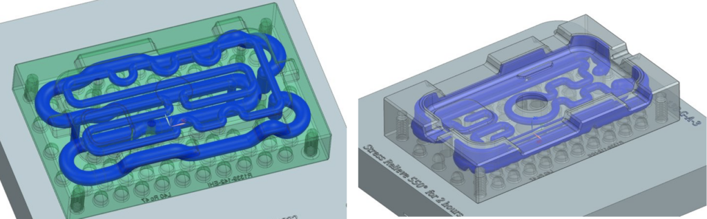 A common challenge when designing parts for injection molding is factoring in cooling rates for distinct areas within a part’s design. In order for the mold to eject the part properly, of course it must be cooled. However, with high-volume or geometrically-complex parts, certain areas of the part may cool at different rates, resulting in longer cycle times and the potential for warpage. To avoid these issues and increase the productivity of the mold, parts can be designed with integrated conformal cooling channels that will allow water to access the deeper areas within the part, providing more even cooling, reducing the cycle time and the occurrence of defects. These approaches have existed for some time, but advances in metal 3D printing has enabled new conformal cooling geometries and resulting solutions to tool makers.