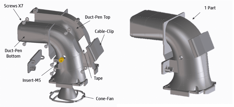 - Time and labor cost reduction achieved through assembly consolidation made possible with molding and 3D printing