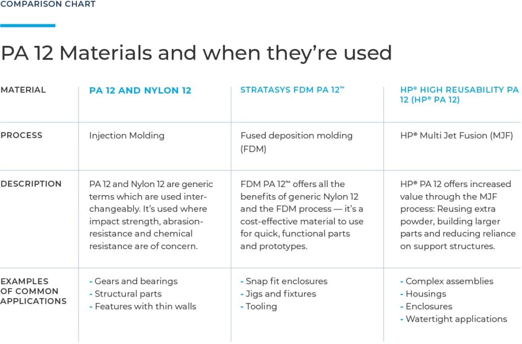 Here, we’ll explain the differences between generic PA 12 / Nylon 12 used in injection molding and Stratasys’ and HP®’s proprietary PA 12 materials. Then we’ll get into the details of how PA 12 is used in FDM and MJF.
