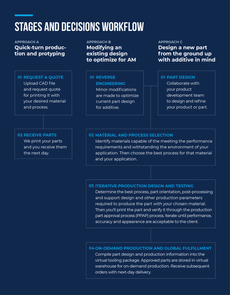 The three approaches outlined above span different product development processes. We’ve outlined the key steps and decision points in those processes in the workflow diagram below. Remember: whichever category your proposed project falls into, you’ll need end-to-end support from your AM provider to ensure your parts are manufactured and delivered with the level of quality, reliability and performance that you require.
